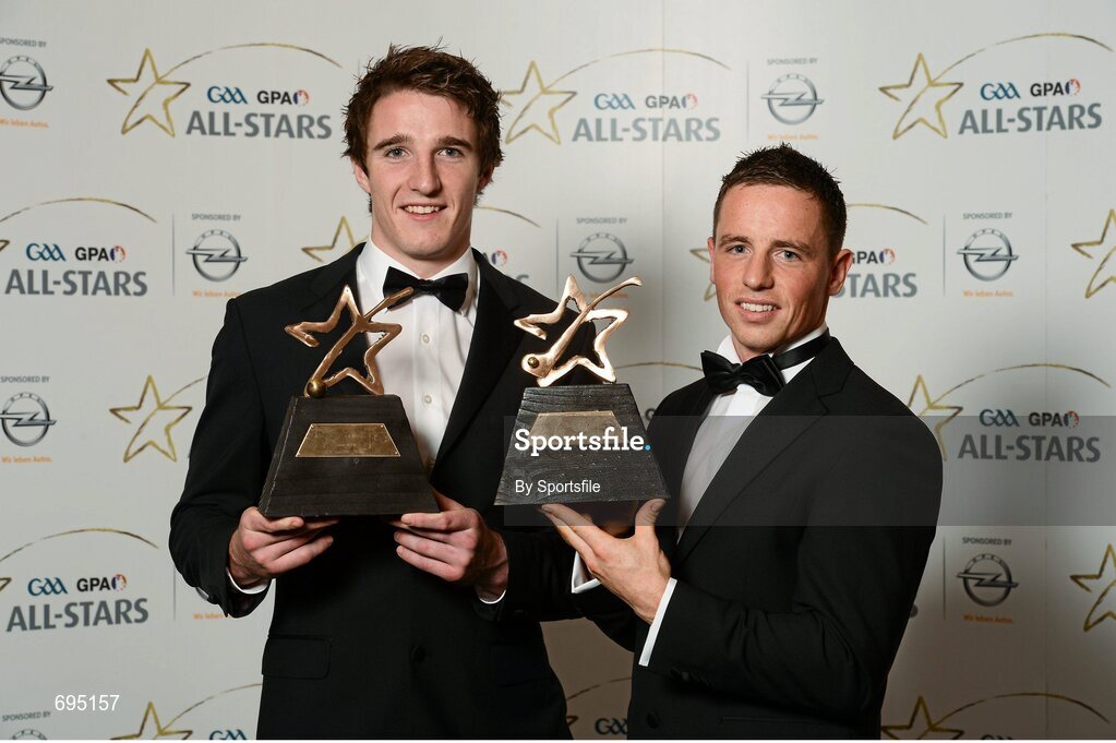 26 October 2012; Cork footballer Aidan Walsh and Cork hurler Anthony Nash, right, with their 2012 GAA GPA All-Star awards, at the GAA GPA All-Star Awards 2012, Sponsored by Opel, National Convention Centre, Dublin. Photo by Sportsfile