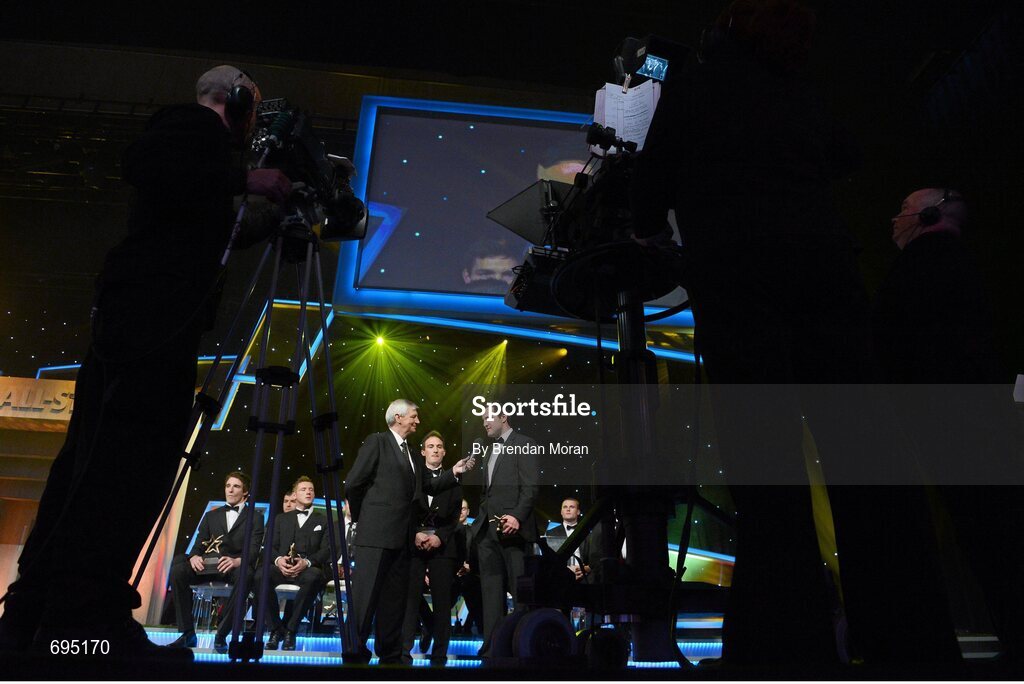 26 October 2012; Donegal footballer Michael Murphy is interviewed by RTE's Michael Lyster at the 2012 GAA GPA All-Star awards, sponsored by Opel. GAA GPA All-Star Awards 2012 Sponsored by Opel, National Convention Centre, Dublin. Picture credit: Brendan Moran / SPORTSFILE