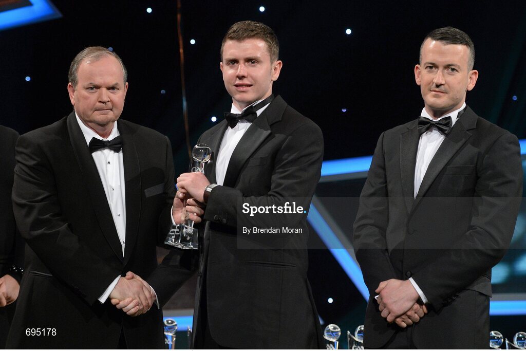 26 October 2012; Conor Woods, Down, is presented with his 2012 Christy Ring Champion 15 Award by Liam Ó Néill, left, Uachtarán, Chumann Lúthchleas Gael and Donal Og Cusack, right, Chairman, Gaelic Players Association. GAA GPA All-Star Awards 2012, National Convention Centre, Dublin. Picture credit: Brendan Moran / SPORTSFILE