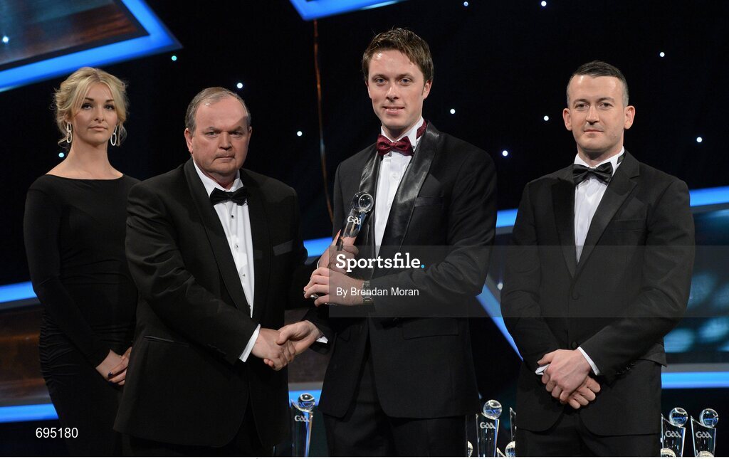 26 October 2012; Jonathan Maher, London, is presented with his 2012 Christy Ring Champion 15 Award by Liam Ó Néill, left, Uachtarán, Chumann Lúthchleas Gael and Donal Og Cusack, right, Chairman, Gaelic Players Association. GAA GPA All-Star Awards 2012, National Convention Centre, Dublin. Picture credit: Brendan Moran / SPORTSFILE