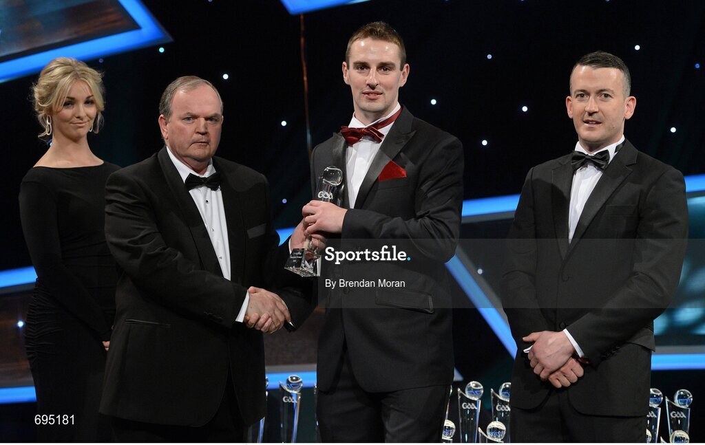 26 October 2012; Mark Moloney, Kildare, is presented with his 2012 Christy Ring Champion 15 Award by Liam Ó Néill, left, Uachtarán, Chumann Lúthchleas Gael and Donal Og Cusack, right, Chairman, Gaelic Players Association. GAA GPA All-Star Awards 2012, National Convention Centre, Dublin. Picture credit: Brendan Moran / SPORTSFILE