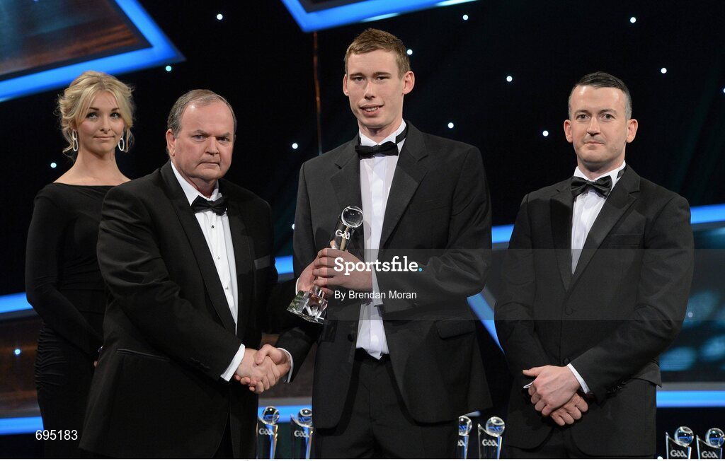 26 October 2012; Ronan Keddy, Wicklow, is presented with his 2012 Christy Ring Champion 15 Award by Liam Ó Néill, left, Uachtarán, Chumann Lúthchleas Gael and Donal Og Cusack, right, Chairman, Gaelic Players Association. GAA GPA All-Star Awards 2012, National Convention Centre, Dublin. Picture credit: Brendan Moran / SPORTSFILE