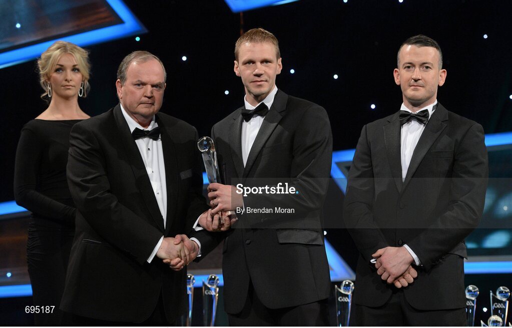 26 October 2012; Paul Braniff, Down, is presented with his 2012 Christy Ring Champion 15 Award by Liam Ó Néill, left, Uachtarán, Chumann Lúthchleas Gael and Donal Og Cusack, right, Chairman, Gaelic Players Association. GAA GPA All-Star Awards 2012, National Convention Centre, Dublin. Picture credit: Brendan Moran / SPORTSFILE