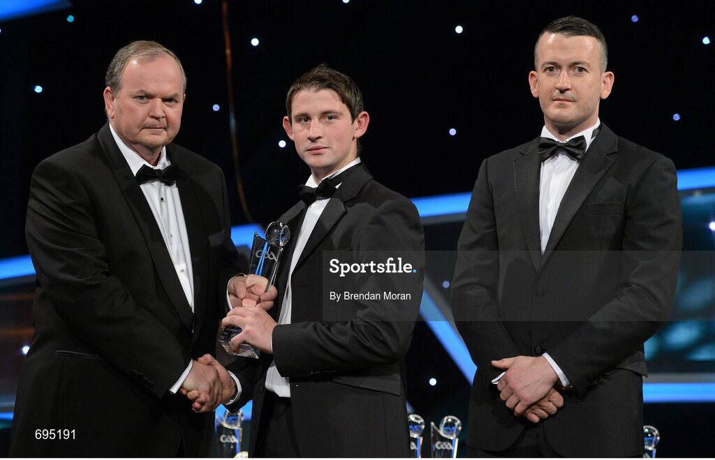 26 October 2012; Kieran McKernan, Armagh, is presented with his 2012 Nicky Rackard Champion 15 Award by Liam Ó Néill, left, Uachtarán, Chumann Lúthchleas Gael and Donal Og Cusack, right, Chairman, Gaelic Players Association. GAA GPA All-Star Awards 2012, National Convention Centre, Dublin. Picture credit: Brendan Moran / SPORTSFILE