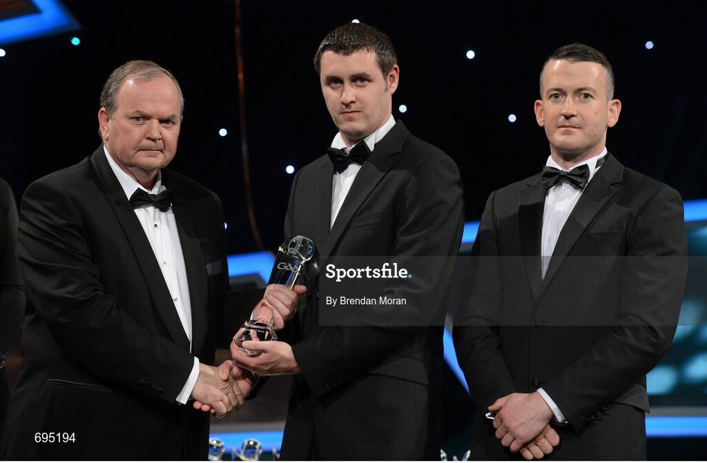 26 October 2012; Sean Melia, Roscommon, is presented with his 2012 Nicky Rackard Champion 15 Award by Liam Ó Néill, left, Uachtarán, Chumann Lúthchleas Gael and Donal Og Cusack, right, Chairman, Gaelic Players Association. GAA GPA All-Star Awards 2012, National Convention Centre, Dublin. Picture credit: Brendan Moran / SPORTSFILE
