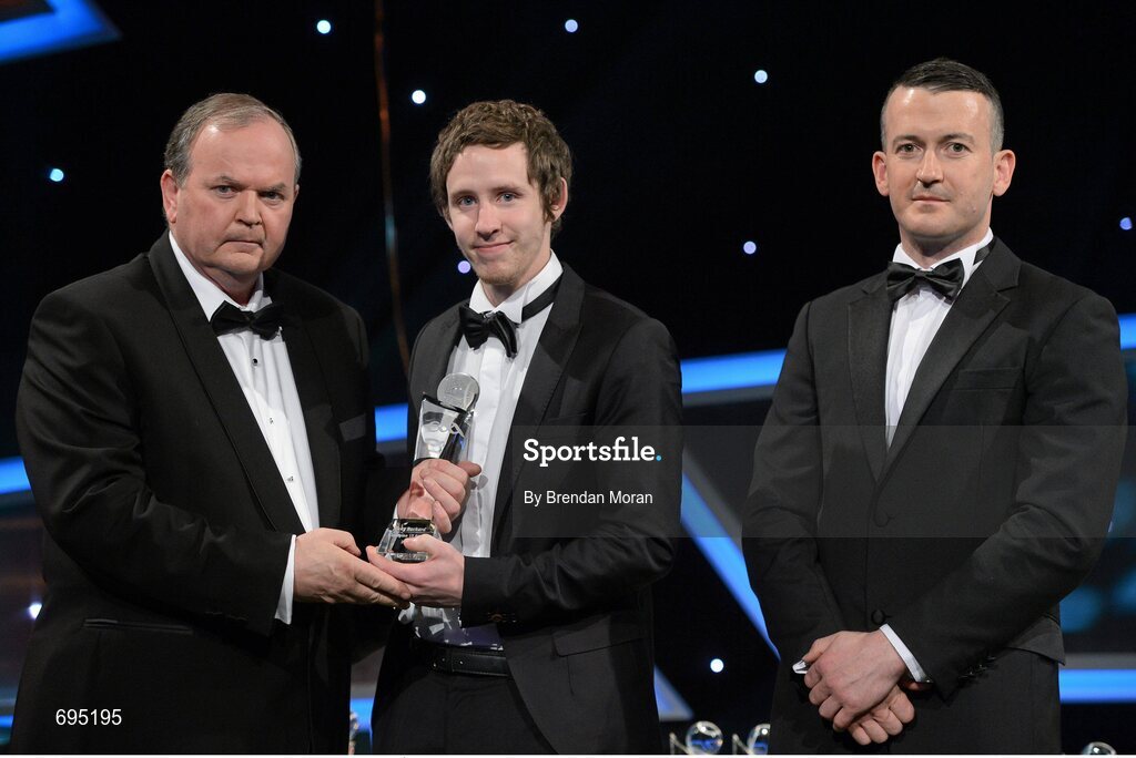 26 October 2012; Brian McGuigan, Monaghan, is presented with his 2012 Nicky Rackard Champion 15 Award by Liam Ó Néill, left, Uachtarán, Chumann Lúthchleas Gael and Donal Og Cusack, right, Chairman, Gaelic Players Association. GAA GPA All-Star Awards 2012, National Convention Centre, Dublin. Picture credit: Brendan Moran / SPORTSFILE