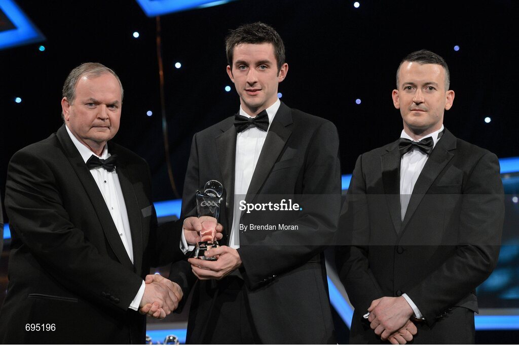 26 October 2012; Paul Gaffney, Armagh, is presented with his 2012 Nicky Rackard Champion 15 Award by Liam Ó Néill, left, Uachtarán, Chumann Lúthchleas Gael and Donal Og Cusack, right, Chairman, Gaelic Players Association. GAA GPA All-Star Awards 2012, National Convention Centre, Dublin. Picture credit: Brendan Moran / SPORTSFILE