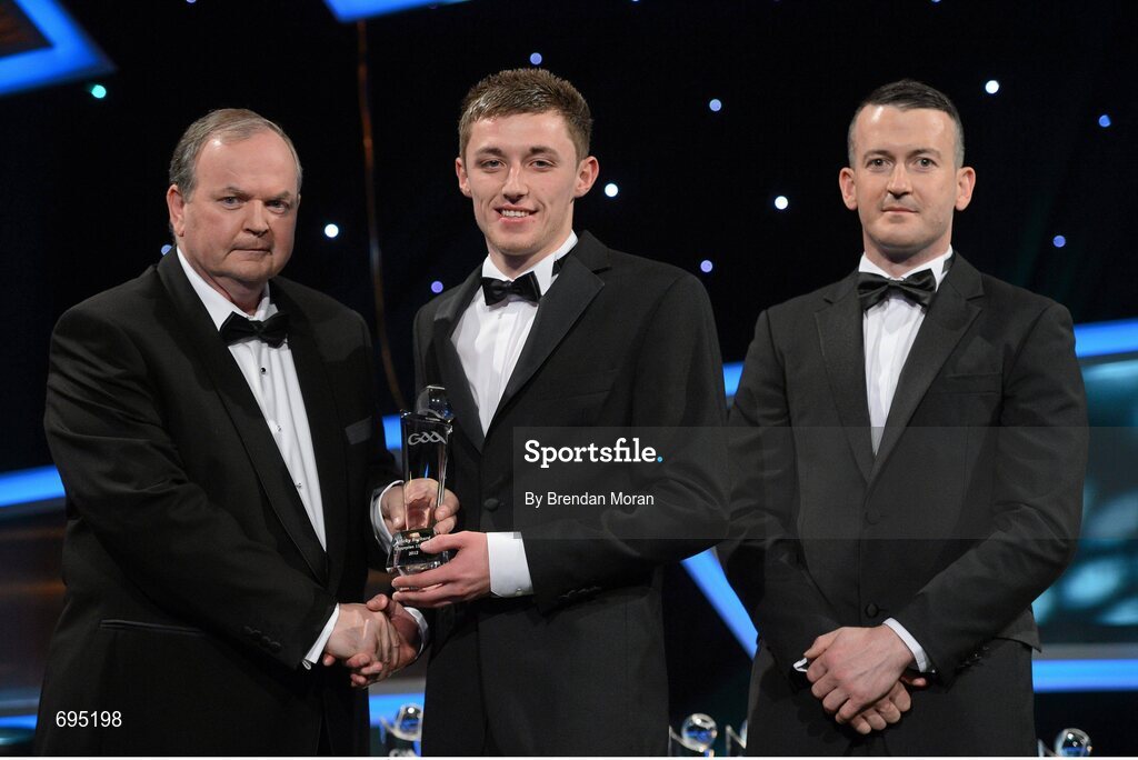26 October 2012; Brian Corcoran, Louth, is presented with his 2012 Nicky Rackard Champion 15 Award by Liam Ó Néill, left, Uachtarán, Chumann Lúthchleas Gael and Donal Og Cusack, right, Chairman, Gaelic Players Association. GAA GPA All-Star Awards 2012, National Convention Centre, Dublin. Picture credit: Brendan Moran / SPORTSFILE