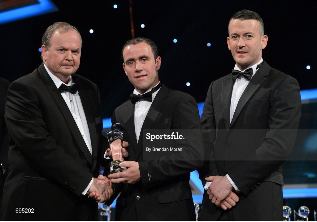 26 October 2012; Trevor Hilliard, Monaghan, is presented with his 2012 Nicky Rackard Champion 15 Award by Liam Ó Néill, left, Uachtarán, Chumann Lúthchleas Gael and Donal Og Cusack, right, Chairman, Gaelic Players Association. GAA GPA All-Star Awards 2012, National Convention Centre, Dublin. Picture credit: Brendan Moran / SPORTSFILE