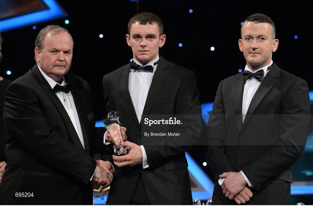 26 October 2012; Brian Donnelly, Roscommon, is presented with his 2012 Nicky Rackard Champion 15 Award by Liam Ó Néill, left, Uachtarán, Chumann Lúthchleas Gael and Donal Og Cusack, right, Chairman, Gaelic Players Association. GAA GPA All-Star Awards 2012, National Convention Centre, Dublin. Picture credit: Brendan Moran / SPORTSFILE