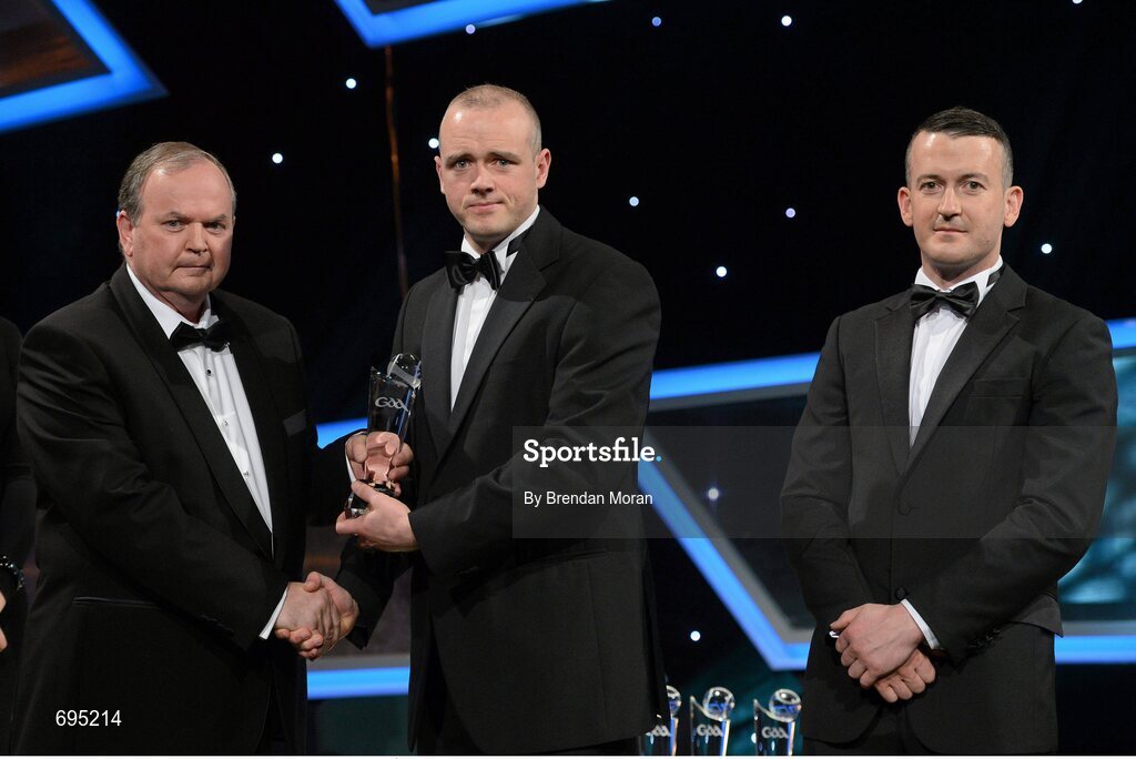 26 October 2012; Clement Cunniffe, Leitrim, is presented with his 2012 Lory Meagher Champion 15 Award by Liam Ó Néill, left, Uachtarán, Chumann Lúthchleas Gael and Donal Og Cusack, right, Chairman, Gaelic Players Association. GAA GPA All-Star Awards 2012, National Convention Centre, Dublin. Picture credit: Brendan Moran / SPORTSFILE