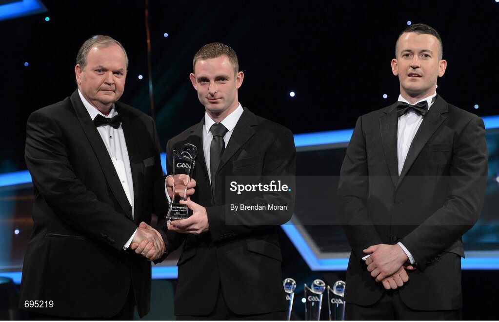 26 October 2012; Kevin McGrath, Leitrim, is presented with his 2012 Lory Meagher Champion 15 Award by Liam Ó Néill, left, Uachtarán, Chumann Lúthchleas Gael and Donal Og Cusack, right, Chairman, Gaelic Players Association. GAA GPA All-Star Awards 2012, National Convention Centre, Dublin. Picture credit: Brendan Moran / SPORTSFILE