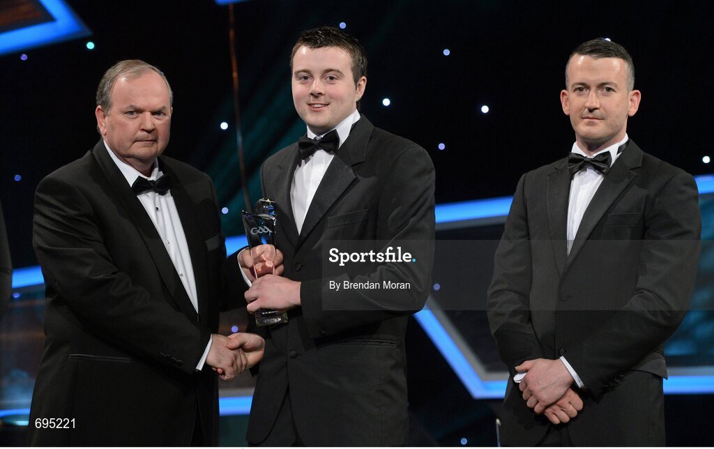 26 October 2012; Conor Grogan, Tyrone, is presented with his 2012 Lory Meagher Champion 15 Award by Liam Ó Néill, left, Uachtarán, Chumann Lúthchleas Gael and Donal Og Cusack, right, Chairman, Gaelic Players Association. GAA GPA All-Star Awards 2012, National Convention Centre, Dublin. Picture credit: Brendan Moran / SPORTSFILE
