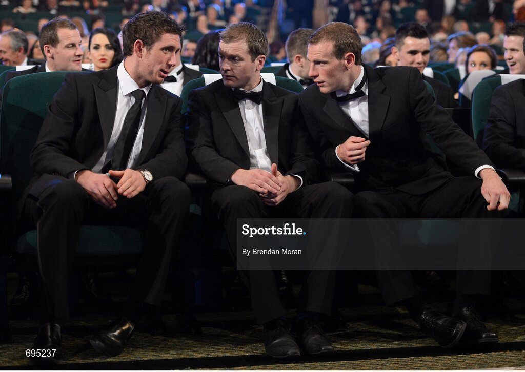 26 October 2012; Kilkenny's Michael Fennelly, left, and JJ Delaney, in conversation with Galway's Cyril Donnellan at the 2012 GAA GPA All-Star awards, sponsored by Opel. GAA GPA All-Star Awards 2012 Sponsored by Opel, National Convention Centre, Dublin. Picture credit: Brendan Moran / SPORTSFILE