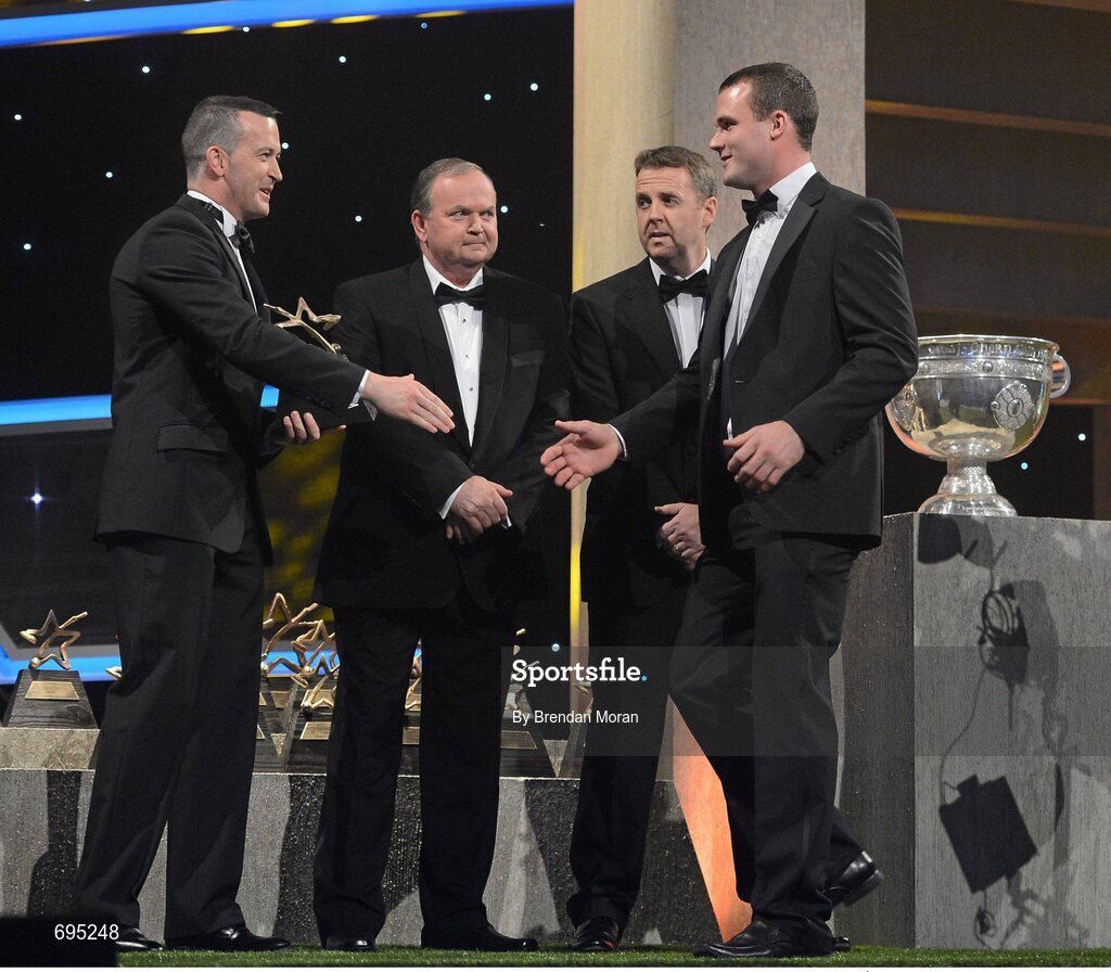 26 October 2012; Donegal's Neil McGee receives his 2012 GAA GPA All-Star award, sponsored by Opel, from Donal Og Cusack, Chairman, Gaelic Players Association, Liam Ó Néill, Uachtarán, Chumann Lúthchleas Gael, and Dave Sheeran, Managing Director, Opel Ireland. GAA GPA All-Star Awards 2012 Sponsored by Opel, National Convention Centre, Dublin. Picture credit: Brendan Moran / SPORTSFILE
