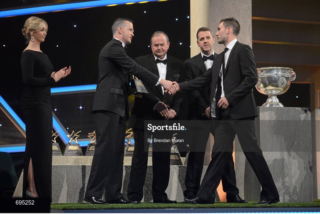 26 October 2012; Donegal's Karl Lacey receives his 2012 GAA GPA All-Star award, sponsored by Opel, from Donal Og Cusack, Chairman, Gaelic Players Association, Liam Ó Néill, Uachtarán, Chumann Lúthchleas Gael, and Dave Sheeran, Managing Director, Opel Ireland. GAA GPA All-Star Awards 2012 Sponsored by Opel, National Convention Centre, Dublin. Picture credit: Brendan Moran / SPORTSFILE