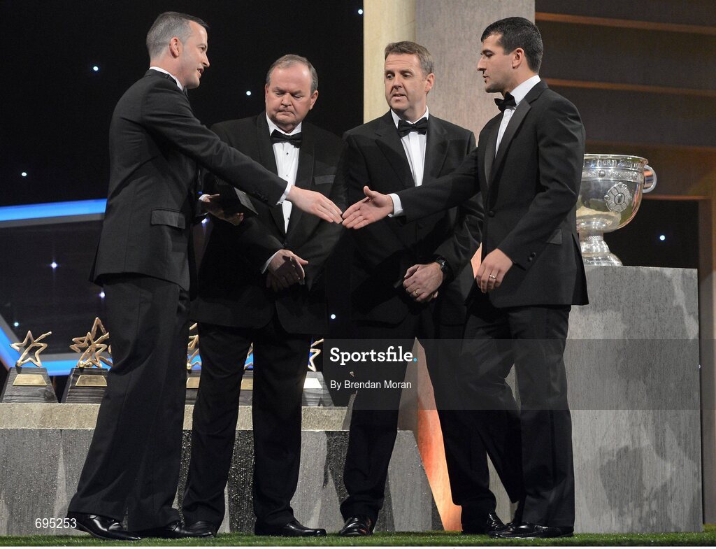 26 October 2012; Donegal's Frank McGlynn receives his 2012 GAA GPA All-Star award, sponsored by Opel, from Donal Og Cusack, Chairman, Gaelic Players Association, Liam Ó Néill, Uachtarán, Chumann Lúthchleas Gael, and Dave Sheeran, Managing Director, Opel Ireland. GAA GPA All-Star Awards 2012 Sponsored by Opel, National Convention Centre, Dublin. Picture credit: Brendan Moran / SPORTSFILE