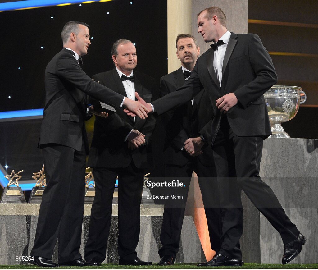 26 October 2012; Donegal's Neil Gallagher receives his 2012 GAA GPA All-Star award, sponsored by Opel, from Donal Og Cusack, Chairman, Gaelic Players Association, Liam Ó Néill, Uachtarán, Chumann Lúthchleas Gael, and Dave Sheeran, Managing Director, Opel Ireland. GAA GPA All-Star Awards 2012 Sponsored by Opel, National Convention Centre, Dublin. Picture credit: Brendan Moran / SPORTSFILE