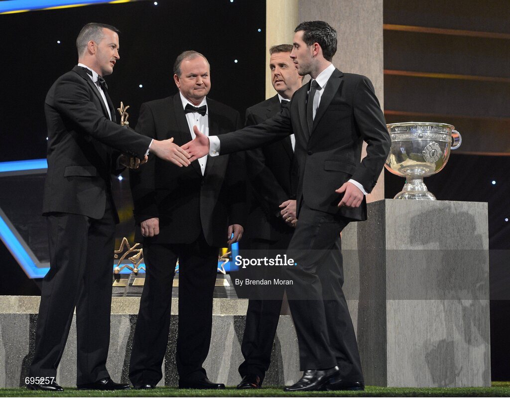 26 October 2012; Donegal's Mark McHugh receives his 2012 GAA GPA All-Star award, sponsored by Opel, from Donal Og Cusack, Chairman, Gaelic Players Association, Liam Ó Néill, Uachtarán, Chumann Lúthchleas Gael, and Dave Sheeran, Managing Director, Opel Ireland. GAA GPA All-Star Awards 2012 Sponsored by Opel, National Convention Centre, Dublin. Picture credit: Brendan Moran / SPORTSFILE