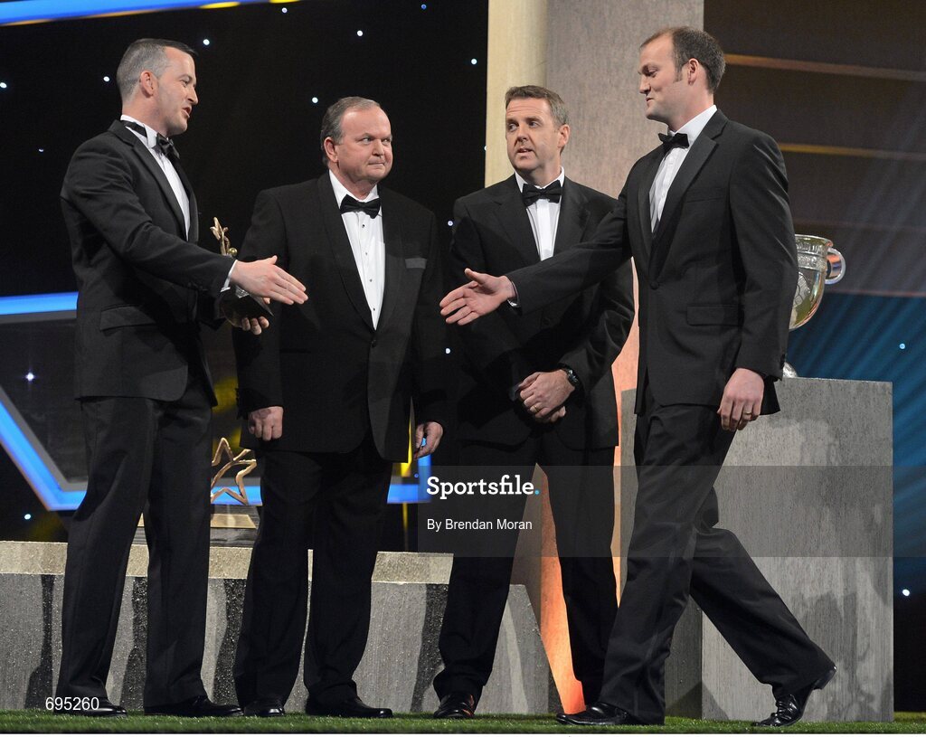 26 October 2012; Donegal's Colm McFadden receives his 2012 GAA GPA All-Star award, sponsored by Opel, from Donal Og Cusack, Chairman, Gaelic Players Association, Liam Ó Néill, Uachtarán, Chumann Lúthchleas Gael, and Dave Sheeran, Managing Director, Opel Ireland. GAA GPA All-Star Awards 2012 Sponsored by Opel, National Convention Centre, Dublin. Picture credit: Brendan Moran / SPORTSFILE