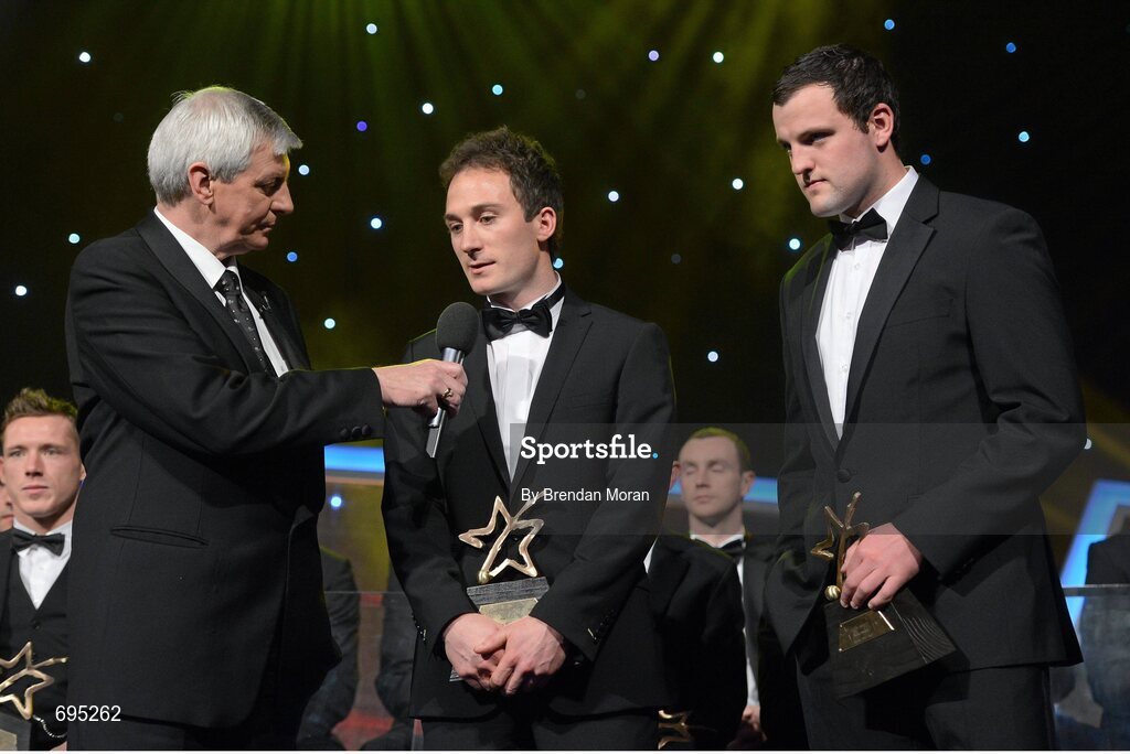 26 October 2012; Mayo's Alan Dillon is interviewed by RTE's Michael Lyster, in the company of Donegal's Michael Murphy, at the 2012 GAA GPA All-Star awards, sponsored by Opel. GAA GPA All-Star Awards 2012 Sponsored by Opel, National Convention Centre, Dublin. Picture credit: Brendan Moran / SPORTSFILE