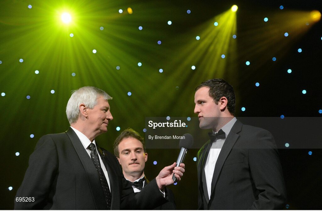 26 October 2012; Donegal's Michael Murphy is interviewed by RTE's Michael Lyster, in the company of Mayo's Alan Dillon, at the 2012 GAA GPA All-Star awards, sponsored by Opel. GAA GPA All-Star Awards 2012 Sponsored by Opel, National Convention Centre, Dublin. Picture credit: Brendan Moran / SPORTSFILE