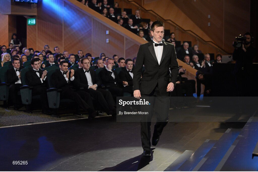 26 October 2012; Mayo's Cillian O'Connor walks up to receive his 2012 GAA GPA Young Footballer of the Year award, sponsored by Opel. GAA GPA All-Star Awards 2012 Sponsored by Opel, National Convention Centre, Dublin. Picture credit: Brendan Moran / SPORTSFILE