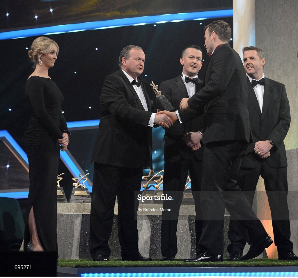 26 October 2012; Galway's David Collins receives his 2012 GAA GPA All-Star award, sponsored by Opel, from Liam Ó Néill, Uachtarán, Chumann Lúthchleas Gael, Donal Og Cusack, Chairman, Gaelic Players Association, and Dave Sheeran, Managing Director, Opel Ireland. GAA GPA All-Star Awards 2012 Sponsored by Opel, National Convention Centre, Dublin. Picture credit: Brendan Moran / SPORTSFILE