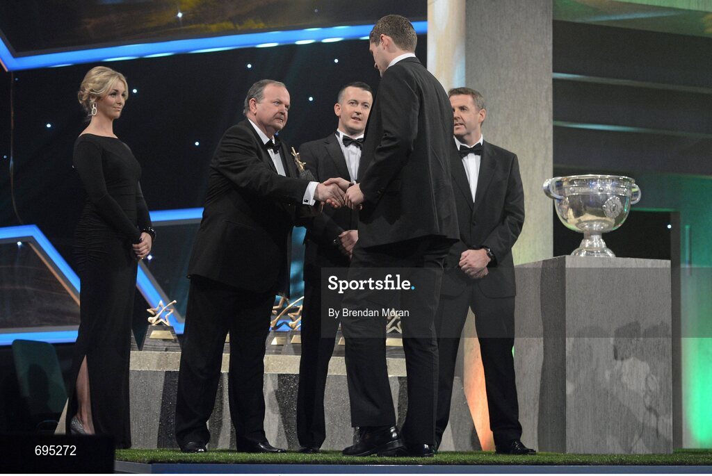 26 October 2012; Galway's Iarla Tannian receives his 2012 GAA GPA All-Star award, sponsored by Opel, from Liam Ó Néill, Uachtarán, Chumann Lúthchleas Gael, Donal Og Cusack, Chairman, Gaelic Players Association, and Dave Sheeran, Managing Director, Opel Ireland. GAA GPA All-Star Awards 2012 Sponsored by Opel, National Convention Centre, Dublin. Picture credit: Brendan Moran / SPORTSFILE