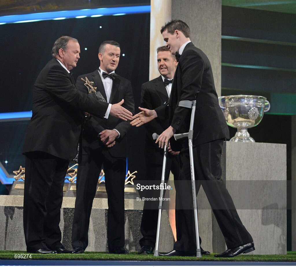 26 October 2012; Kilkenny's TJ Reid receives his 2012 GAA GPA All-Star award, sponsored by Opel, from Liam Ó Néill, Uachtarán, Chumann Lúthchleas Gael, Donal Og Cusack, Chairman, Gaelic Players Association, and Dave Sheeran, Managing Director, Opel Ireland. GAA GPA All-Star Awards 2012 Sponsored by Opel, National Convention Centre, Dublin. Picture credit: Brendan Moran / SPORTSFILE