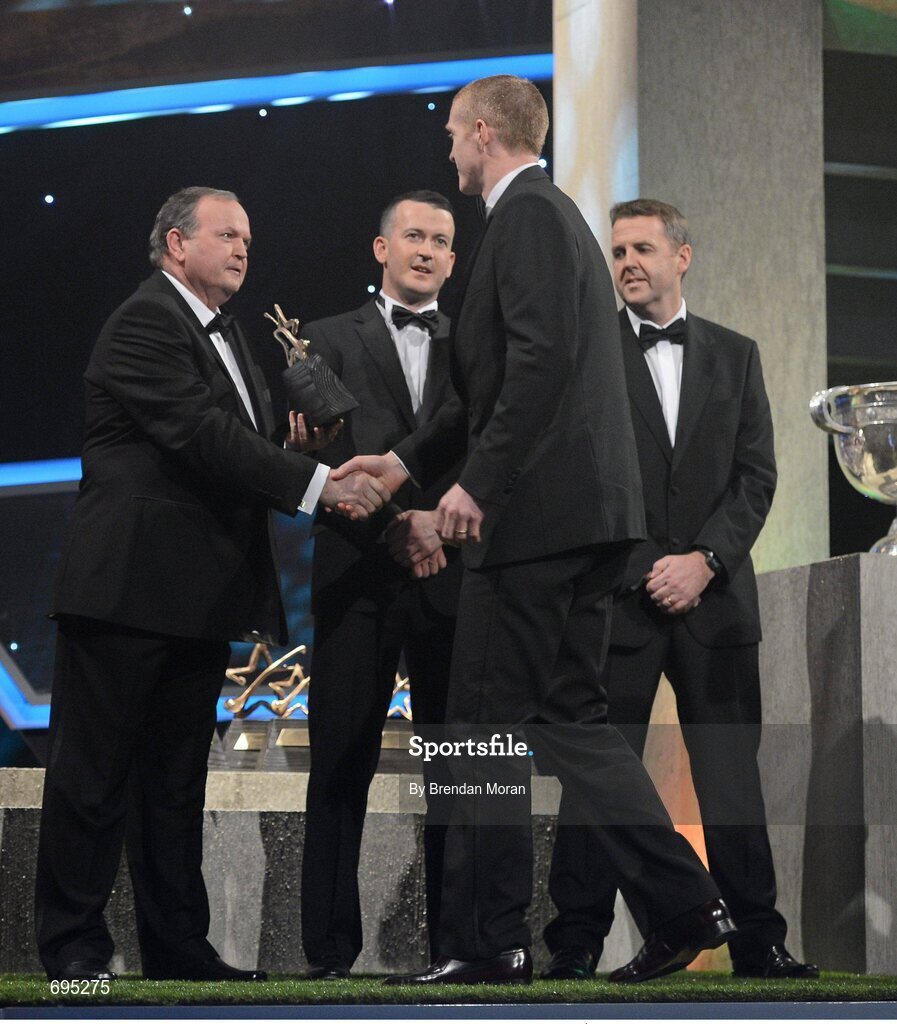 26 October 2012; Kilkenny's Henry Shefflin receives his 2012 GAA GPA All-Star award, sponsored by Opel, from Liam Ó Néill, Uachtarán, Chumann Lúthchleas Gael, Donal Og Cusack, Chairman, Gaelic Players Association, and Dave Sheeran, Managing Director, Opel Ireland. GAA GPA All-Star Awards 2012 Sponsored by Opel, National Convention Centre, Dublin. Picture credit: Brendan Moran / SPORTSFILE