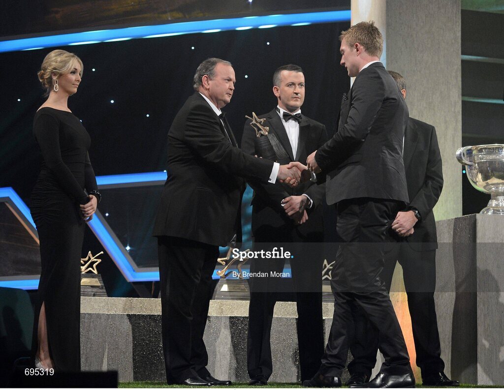 26 October 2012; Galway's Joe Canning receives his 2012 GAA GPA All-Star award, sponsored by Opel, from Liam Ó Néill, Uachtarán, Chumann Lúthchleas Gael, Donal Og Cusack, Chairman, Gaelic Players Association, and Dave Sheeran, Managing Director, Opel Ireland. GAA GPA All-Star Awards 2012 Sponsored by Opel, National Convention Centre, Dublin. Picture credit: Brendan Moran / SPORTSFILE