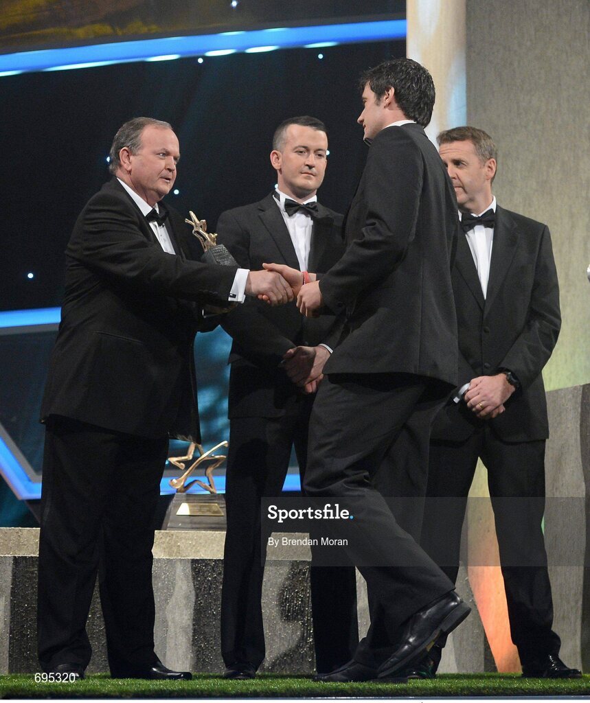 26 October 2012; Galway's David Burke receives his 2012 GAA GPA All-Star award, sponsored by Opel, from Liam Ó Néill, Uachtarán, Chumann Lúthchleas Gael, Donal Og Cusack, Chairman, Gaelic Players Association, and Dave Sheeran, Managing Director, Opel Ireland. GAA GPA All-Star Awards 2012 Sponsored by Opel, National Convention Centre, Dublin. Picture credit: Brendan Moran / SPORTSFILE
