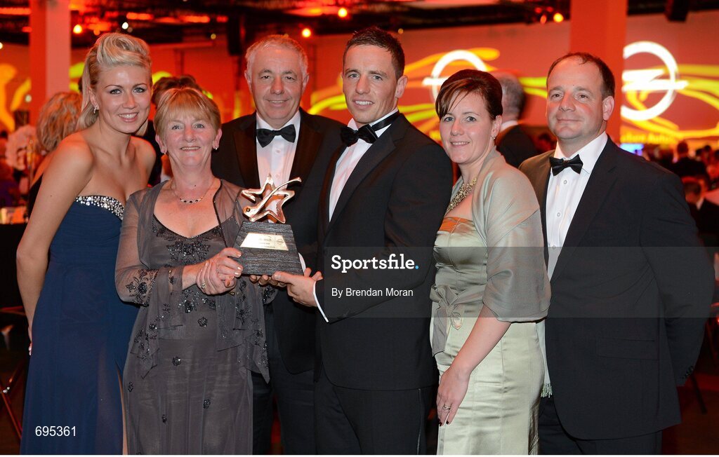 26 October 2012; Cork goalkeeper Anthony Nash, 3rd from right, and his family, from left, Natalia Gorak, Phyllis and Tom Nash, Edwina and Michael Gottstein, with his 2012 GAA GPA All-Star award, sponsored by Opel. GAA GPA All-Star Awards 2012 Sponsored by Opel, National Convention Centre, Dublin. Picture credit: Brendan Moran / SPORTSFILE
