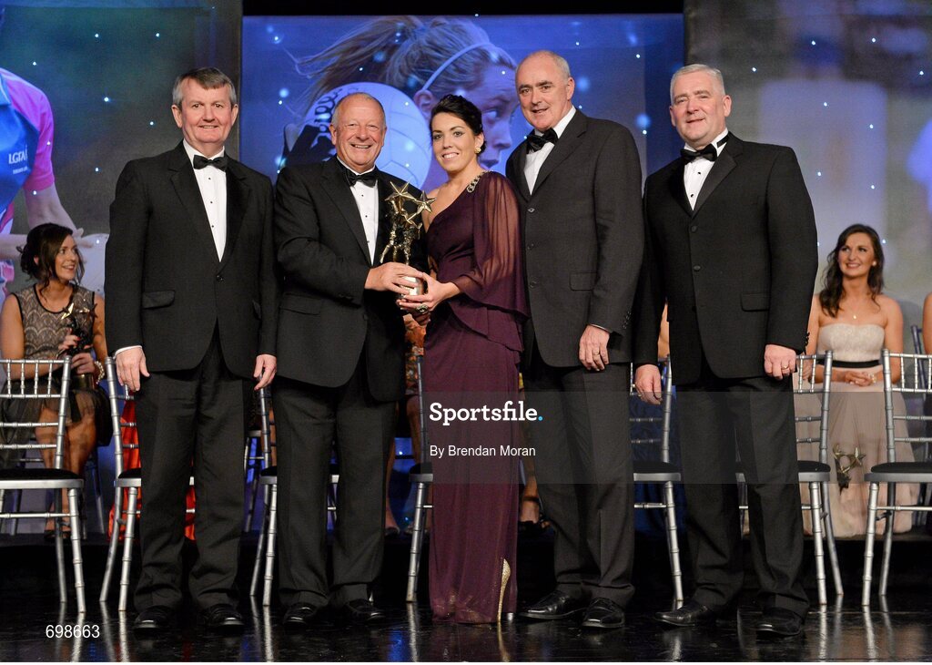 10 November 2012; Sarah Houlihan, Kerry, is presented with her All-Star award by Pat Quill, President, Ladies Gaelic Football Association, in the company of, from left, Pol O Gallchoir, Ceannsaí, TG4, Liam Moggan, National Coach Development Officer, Coaching Ireland, and Cormac Farrell, O'Neill's. TG4 O'Neill's Ladies Football All-Star Awards 2012, Citywest Hotel, Saggart, Co. Dublin. Picture credit: Brendan Moran / SPORTSFILE