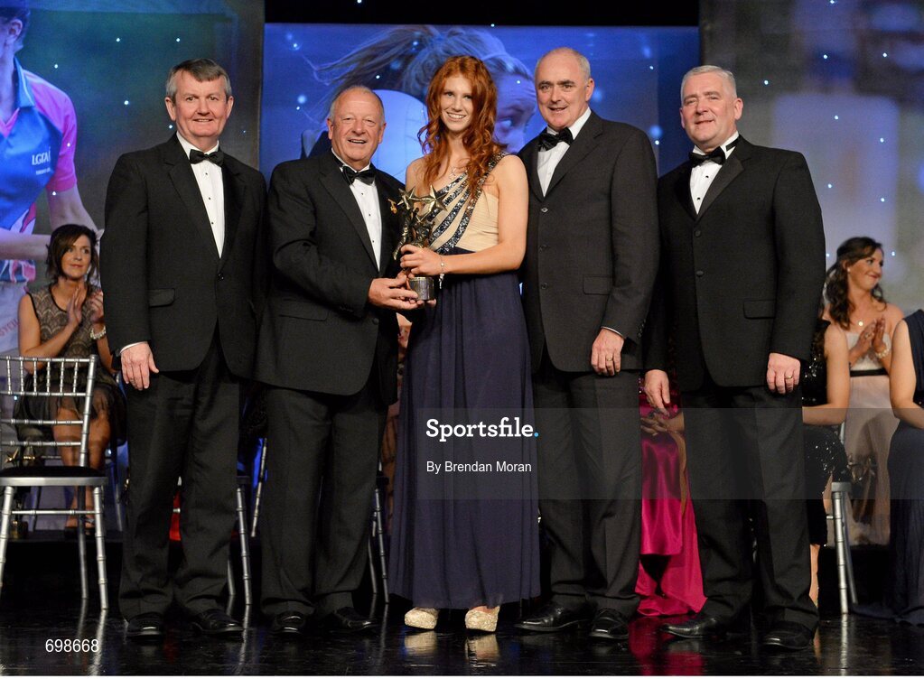 10 November 2012; Louise Ni Mhuircheartaigh, Kerry, is presented with her All-Star award by Pat Quill, President, Ladies Gaelic Football Association, in the company of, from left, Pol O Gallchoir, Ceannsaí, TG4, Liam Moggan, National Coach Development Officer, Coaching Ireland, and Cormac Farrell, O'Neill's. TG4 O'Neill's Ladies Football All-Star Awards 2012, Citywest Hotel, Saggart, Co. Dublin. Picture credit: Brendan Moran / SPORTSFILE