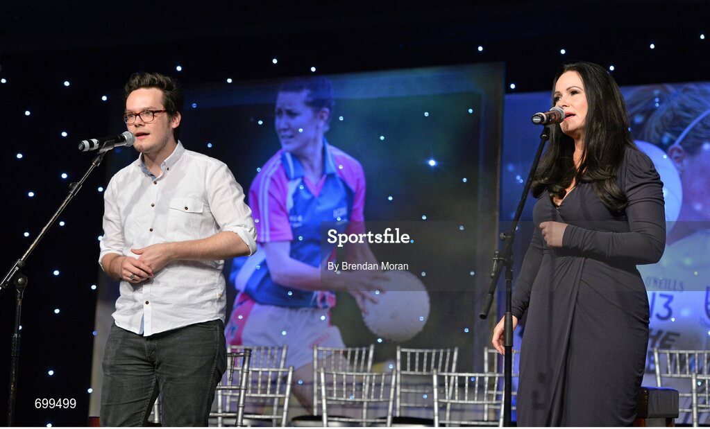 10 November 2012; Singers Tim and Hermione Hennessy performing during the TG4 O'Neill's Ladies Football Allstar awards. TG4 O'Neill's Ladies Football All-Star Awards 2012, Citywest Hotel, Saggart, Co. Dublin. Picture credit: Brendan Moran / SPORTSFILE