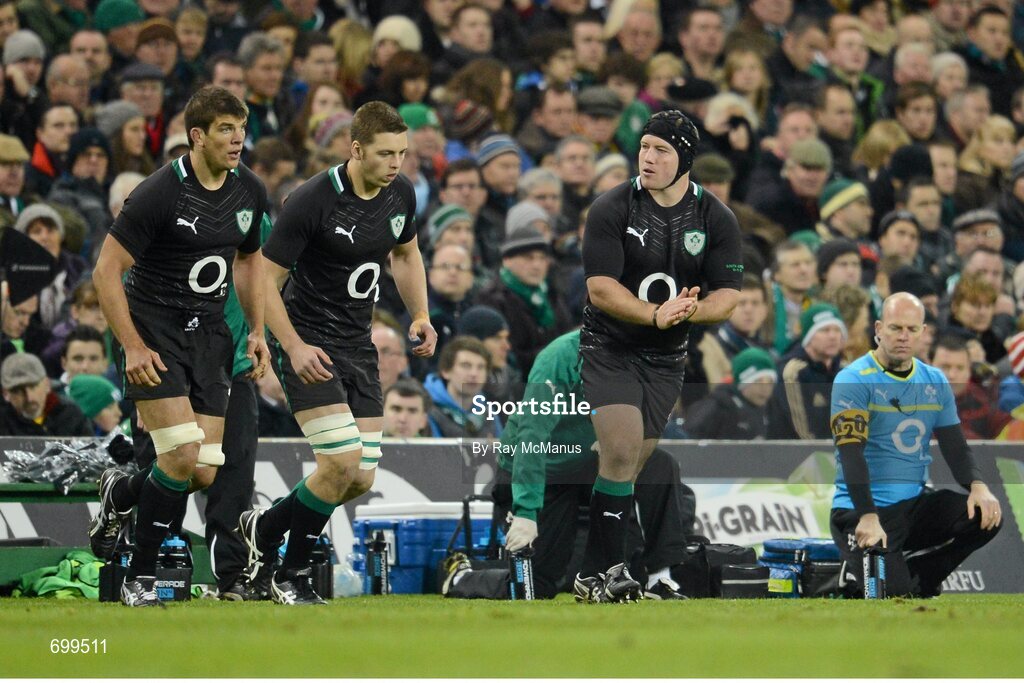 10 November 2012; Ireland players, from left, Donncha O'Callaghan, Iain Henderson and Michael Bent, right, come onto the pitch as replacements late in the game. Autumn International, Ireland v South Africa, Aviva Stadium, Lansdowne Road, Dublin. Picture credit: Ray McManus / SPORTSFILE