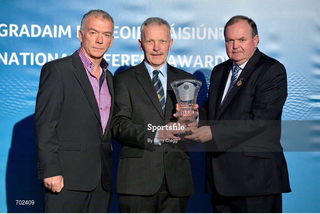 24 November 2012; Referee Paddy Russell, from Tipperary, is presented with his Hall of Fame Award award by Uachtarán Chumann Lúthchleas Gael Liam Ó Néill, right, and Pat McEnaney, Chairman of the National Referees Committee. 2012 National Referees' Awards Banquet, Croke Park, Dublin. Picture credit: Barry Cregg / SPORTSFILE