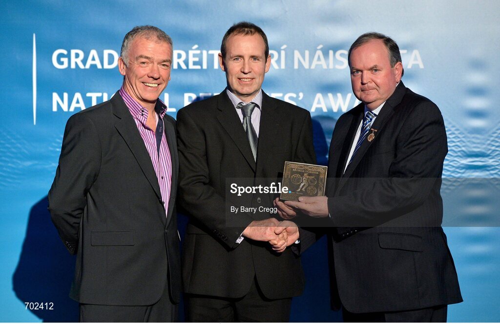 24 November 2012; Referee Ciaran Groome, from Offaly, is presented with his retiring referees' award by Uachtarán Chumann Lúthchleas Gael Liam Ó Néill, right, and Chairman of the National Referees Committee, Pat McEnaney. 2012 National Referees' Awards Banquet, Croke Park, Dublin. Picture credit: Barry Cregg / SPORTSFILE