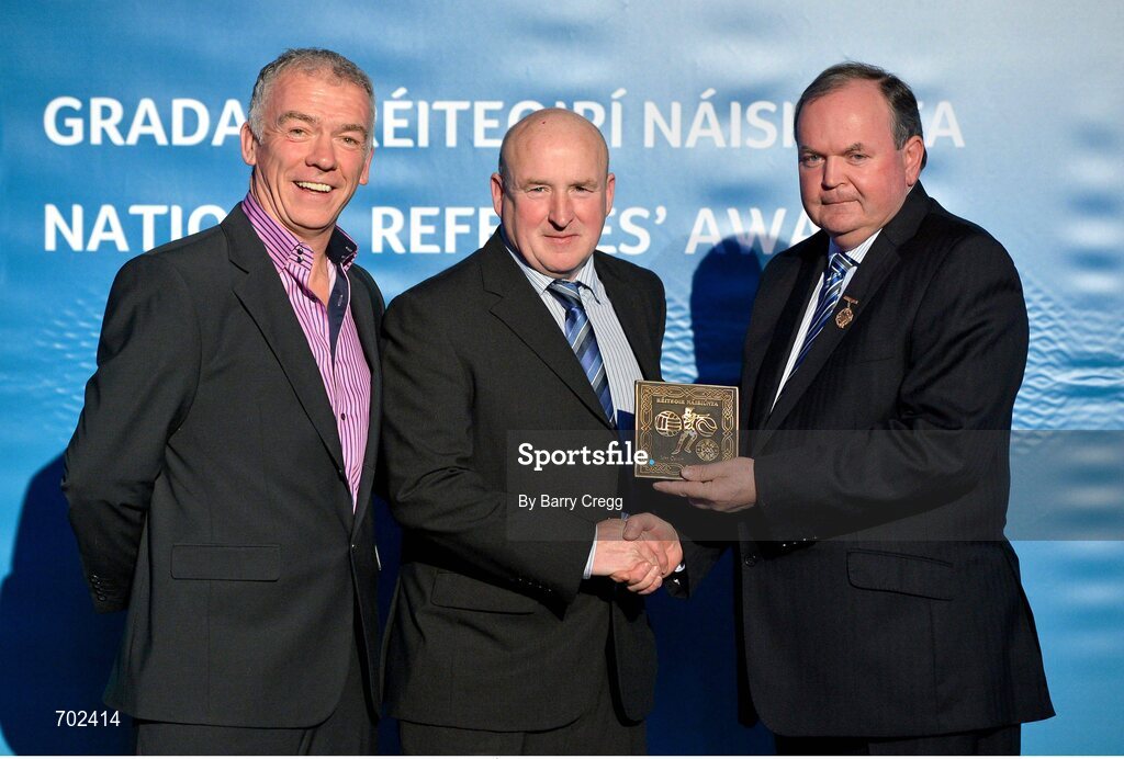 24 November 2012; Referee John Devlin, from Tyrone, is presented with his retiring referees' award by Uachtarán Chumann Lúthchleas Gael Liam Ó Néill, right, and Chairman of the National Referees Committee, Pat McEnaney. 2012 National Referees' Awards Banquet, Croke Park, Dublin. Picture credit: Barry Cregg / SPORTSFILE