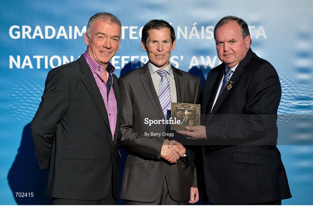 24 November 2012; Referee Gregory Walsh, from Antrim, is presented with his retiring referees' award by Uachtarán Chumann Lúthchleas Gael Liam Ó Néill, right, and Chairman of the National Referees Committee, Pat McEnaney. 2012 National Referees' Awards Banquet, Croke Park, Dublin. Picture credit: Barry Cregg / SPORTSFILE
