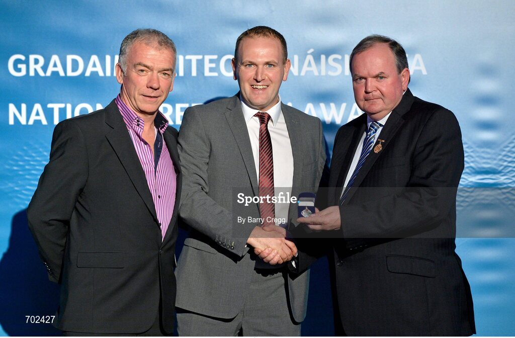 24 November 2012; Referee Conor Lane, from Cork, is presented with his Allianz Football League Division 3 referees' medal by Uachtarán Chumann Lúthchleas Gael Liam Ó Néill, right, and Chairman of the National Referees Committee, Pat McEnaney. 2012 National Referees' Awards Banquet, Croke Park, Dublin. Picture credit: Barry Cregg / SPORTSFILE