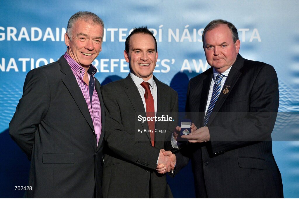24 November 2012; Referee David Coldrick, from Meath, is presented with his Allianz Football League Division 2 referees' medal by Uachtarán Chumann Lúthchleas Gael Liam Ó Néill, right, and Chairman of the National Referees Committee, Pat McEnaney. 2012 National Referees' Awards Banquet, Croke Park, Dublin. Picture credit: Barry Cregg / SPORTSFILE