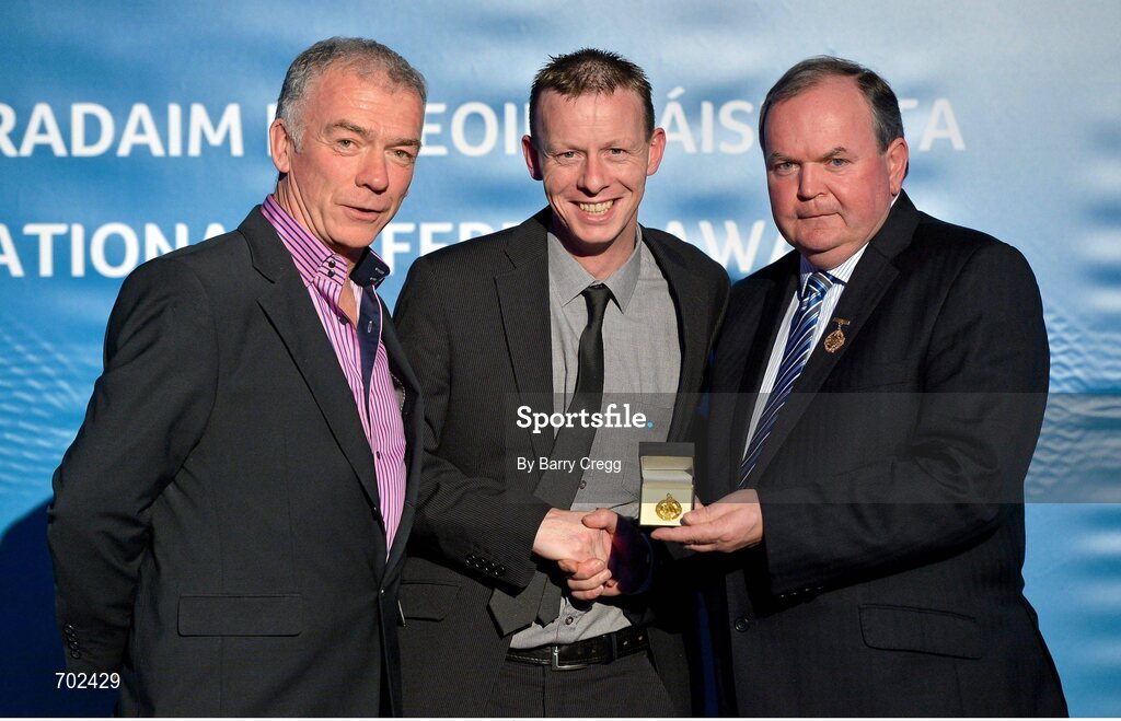 24 November 2012; Referee Joe McQuillan, from Cavan, is presented with his Sigerson Cup referees' medal by Uachtarán Chumann Lúthchleas Gael Liam Ó Néill, right, and Chairman of the National Referees Committee, Pat McEnaney. 2012 National Referees' Awards Banquet, Croke Park, Dublin. Picture credit: Barry Cregg / SPORTSFILE