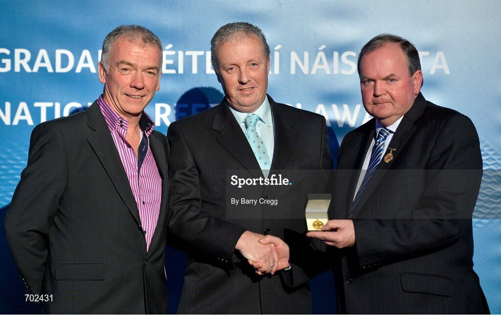 24 November 2012; Referee Pat Casey, from Waterford, is presented with his All-Ireland Intermediate Hurling Club Championship referees' medal by Uachtarán Chumann Lúthchleas Gael Liam Ó Néill, right, and Chairman of the National Referees Committee, Pat McEnaney. 2012 National Referees' Awards Banquet, Croke Park, Dublin. Picture credit: Barry Cregg / SPORTSFILE