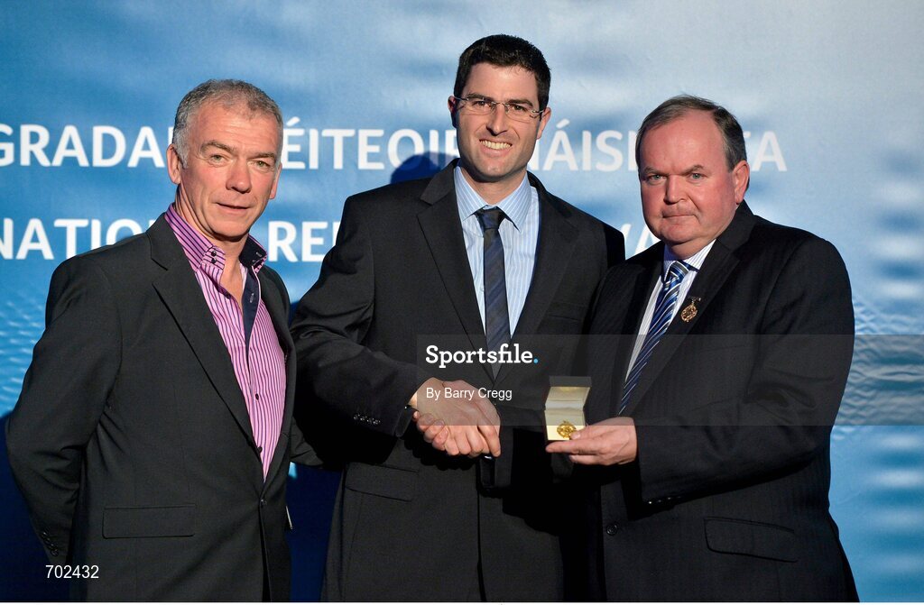 24 November 2012; Referee Gary McCormack, from Dublin, is presented with his All-Ireland Junior Football Club Championship referees' medal by Uachtarán Chumann Lúthchleas Gael Liam Ó Néill, right, and Chairman of the National Referees Committee, Pat McEnaney. 2012 National Referees' Awards Banquet, Croke Park, Dublin. Picture credit: Barry Cregg / SPORTSFILE