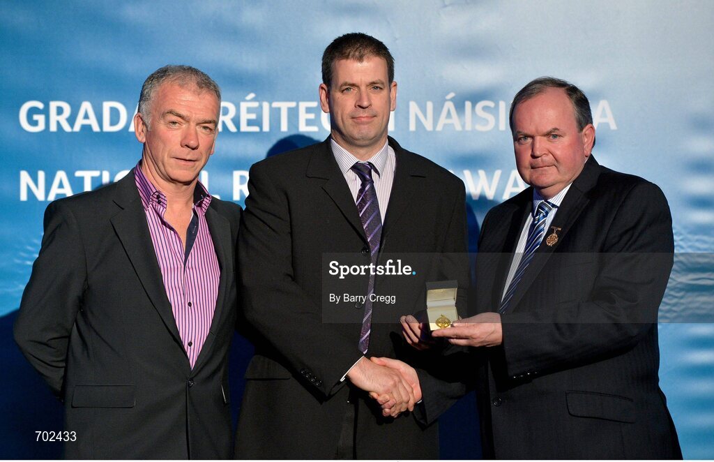 24 November 2012; Referee Damien Brazil, from Offaly, is presented with his All-Ireland Intermediate Football Club Championship referees' medal by Uachtarán Chumann Lúthchleas Gael Liam Ó Néill, right, and Chairman of the National Referees Committee, Pat McEnaney. 2012 National Referees' Awards Banquet, Croke Park, Dublin. Picture credit: Barry Cregg / SPORTSFILE