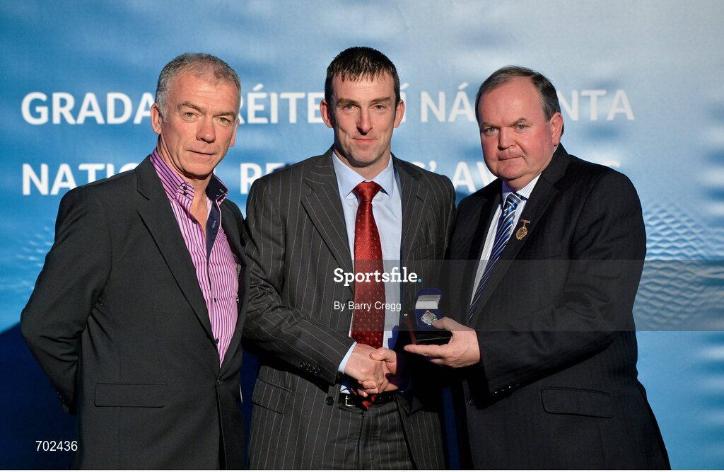 24 November 2012; Referee Paud O'Dwyer, from Carlow, is presented with his Nicky Rackard & Allianz Hurling League Division 3B referees' medal by Uachtarán Chumann Lúthchleas Gael Liam Ó Néill, right, and Chairman of the National Referees Committee, Pat McEnaney. 2012 National Referees' Awards Banquet, Croke Park, Dublin. Picture credit: Barry Cregg / SPORTSFILE