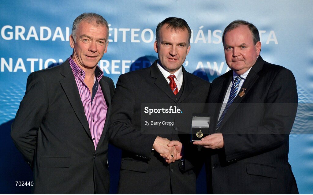 24 November 2012; Referee Diarmuid Kirwan, from Cork, is presented with his All-Ireland U21 Hurling Chamionship referees' medal by Uachtarán Chumann Lúthchleas Gael Liam Ó Néill, right, and Chairman of the National Referees Committee, Pat McEnaney. 2012 National Referees' Awards Banquet, Croke Park, Dublin. Picture credit: Barry Cregg / SPORTSFILE